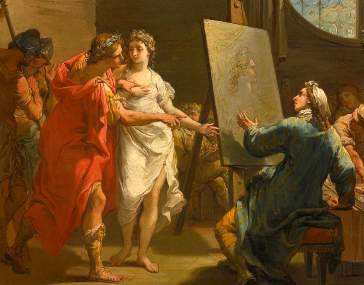 In the first and the third paintings, the figure of Apelles is a self-portraiit of Tiepolo, and in all three paintings Campaspe is modelled by Tiepolo's wife Cecilia.